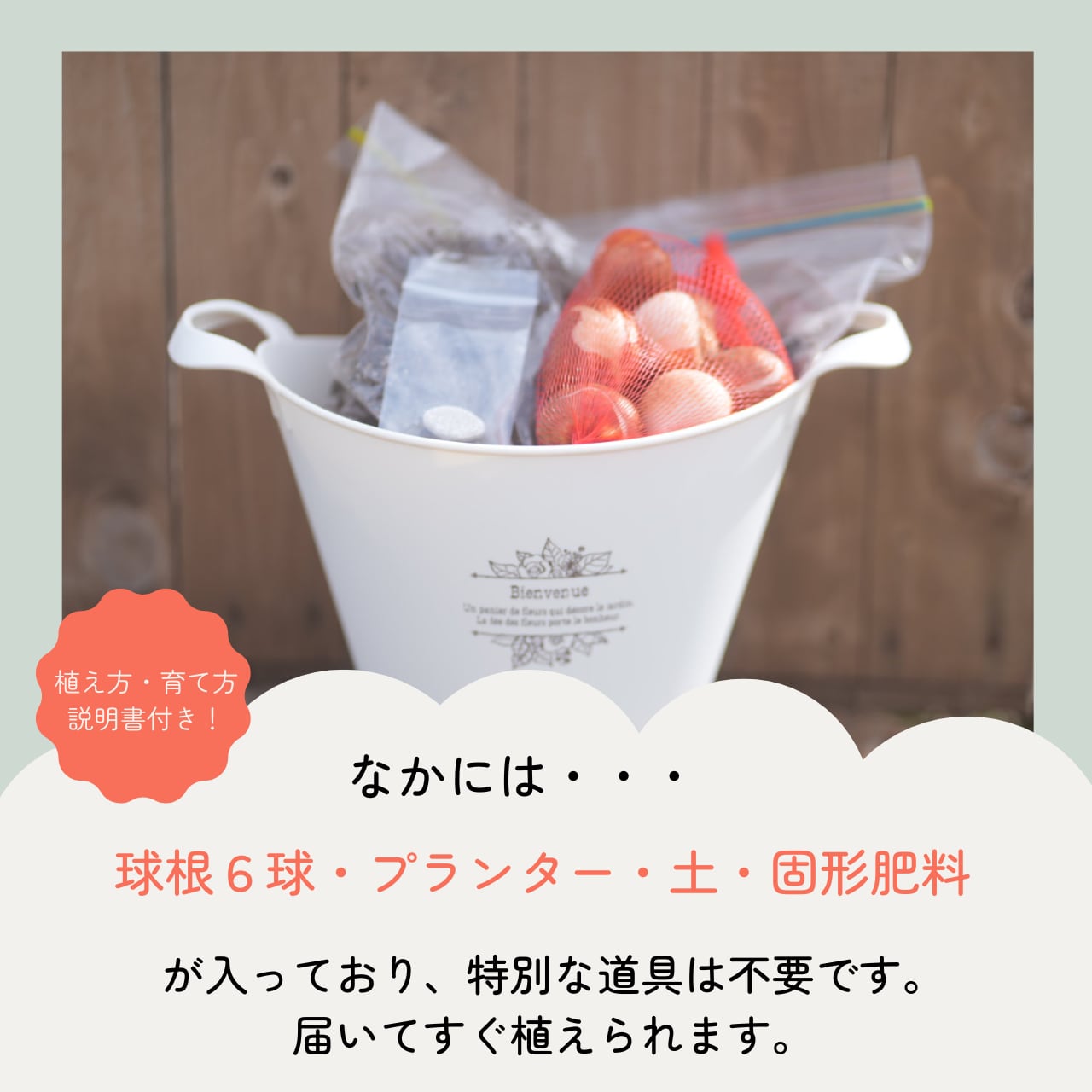 このチューリップ栽培キットは、初心者でも簡単に始められる栽培セットです!栽培説明書付きで、すぐにでも育て始められる充実の内容となっています。プランターも付属しているため、場所を選ばず、あなたの好きな場所で華やかなチューリップを育てることができます。春の訪れを楽しみに、心が躍るガーデニングを始めてみませんか?
